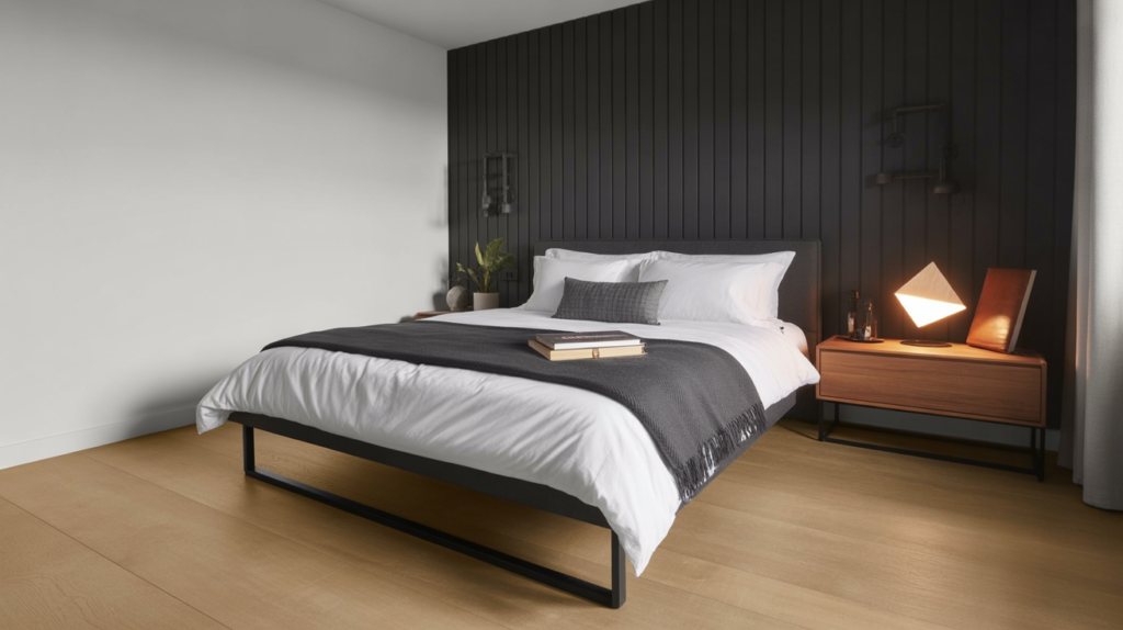 Pairing the dark wall with lighter furniture creates contrast and balance. It’s a great way to make your room feel more dynamic while staying within budget.