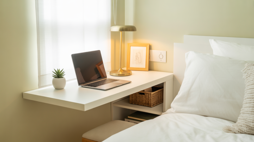 Adding a small workspace corner to your bedroom can increase both functionality and style. A compact desk and chair are all you need to create a productive environment without taking up too much space. This setup is especially useful for students or remote workers who need a dedicated area for focus.