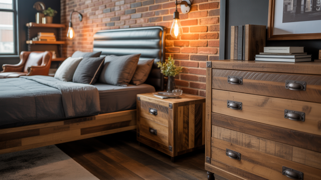 An industrial-style bedroom gives off a strong, masculine vibe while being surprisingly budget-friendly to achieve. This look focuses on raw materials like metal, wood, and neutral tones, which can often be found at affordable prices or even repurposed from existing furniture. You don’t need actual brick walls to create the effect—peel-and-stick wallpaper can replicate that rugged texture without costing much. A simple metal bed frame combined with wooden furniture pieces instantly builds the foundation of this style.