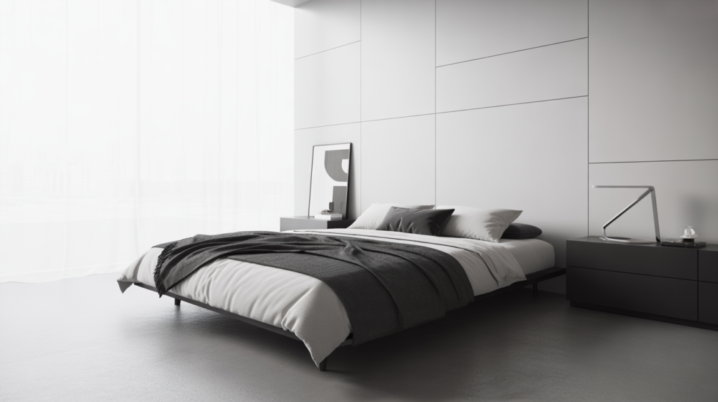 To elevate this look on a budget, incorporate small accents like a textured throw blanket, a simple rug, or framed black-and-white prints. Lighting also plays a major role, so consider adding a soft bedside lamp or LED strip lights to create depth and mood. The beauty of this setup lies in its flexibility, allowing you to gradually upgrade pieces over time without disrupting the overall aesthetic. It’s a perfect solution for anyone wanting a sleek, affordable, and timeless bedroom design.