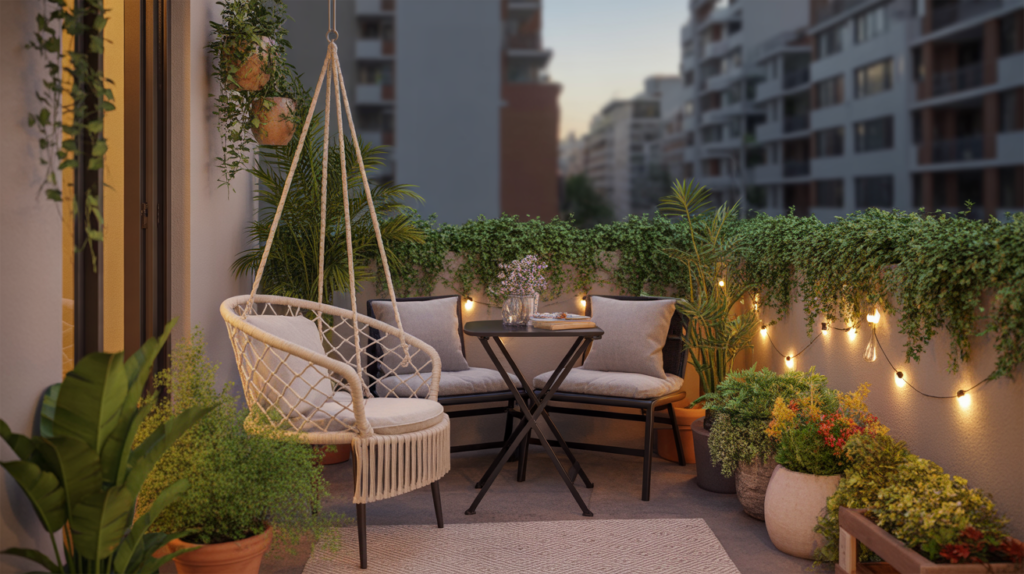 Incorporate vertical gardening or hanging plants to make the most of limited space. String lights or small lanterns can add warmth and ambiance, especially in the evening. This setup proves that you don’t need a large backyard to enjoy outdoor living. With thoughtful design, even the smallest balcony can become a charming and inviting retreat.