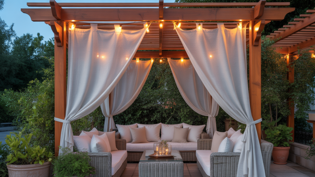 A covered pergola lounge offers both shade and style, making it a versatile outdoor living space. Use a wooden pergola structure and add flowing curtains or fabric drapes to create a soft and inviting atmosphere. Comfortable seating with plush cushions makes the space perfect for lounging and relaxing.