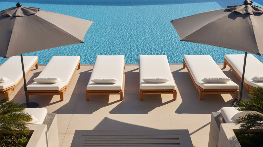 A poolside luxury lounge brings resort-style comfort to your home. Start with high-quality sunbeds or loungers paired with large umbrellas for shade. Choose sleek, modern furniture to create a polished and upscale look. Keep the color palette light and fresh to reflect the bright outdoor environment.