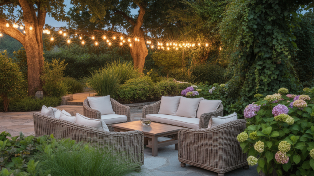 To complete the look, surround the space with lush greenery and potted plants to create a natural oasis. Mix different plant heights and textures for visual interest and depth. Incorporating natural materials like wicker, bamboo, and wood helps tie everything together. This outdoor setup feels intimate and inviting, making it the perfect spot for relaxing evenings, casual gatherings, or simply enjoying a peaceful moment under the open sky.