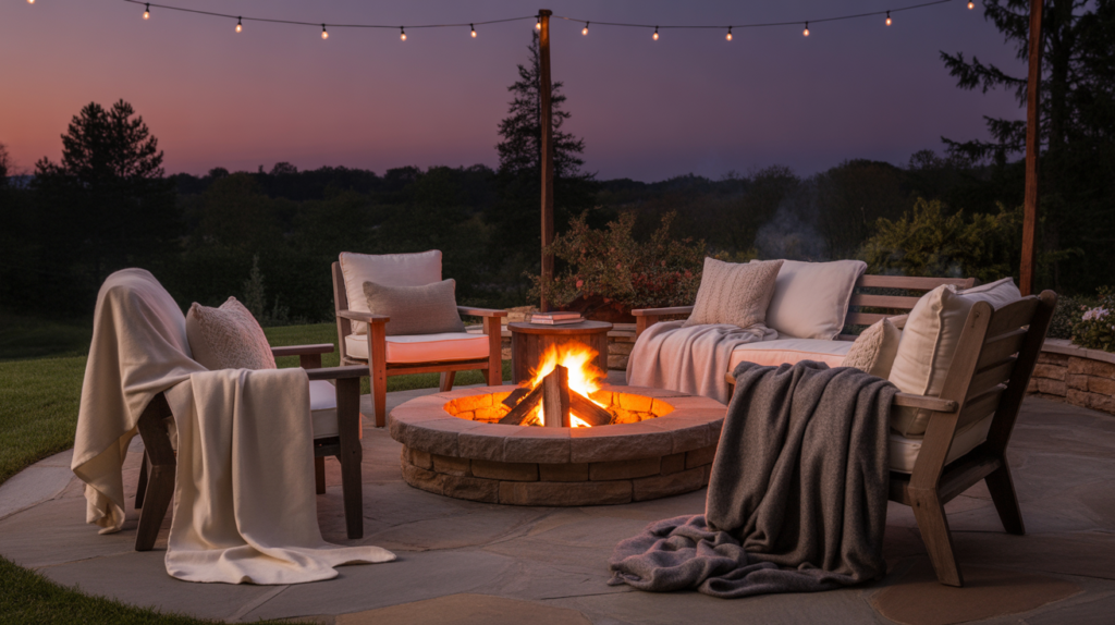 Enhance the setup with natural materials like stone or wood to create a rustic yet stylish look. Surround the area with subtle lighting to maintain a cozy atmosphere without overpowering the fire’s glow. This type of outdoor living space is ideal for socializing, roasting marshmallows, or simply enjoying a peaceful night under the stars.