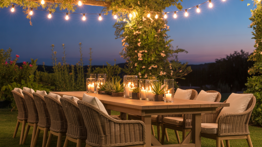 An elegant outdoor dining area turns everyday meals into special experiences. Start with a sturdy wooden or metal dining table paired with comfortable chairs. Add soft cushions or seat pads to enhance comfort and style. Use a neutral color palette with subtle accents to create a refined and cohesive look. This setup works beautifully for both casual meals and formal gatherings.