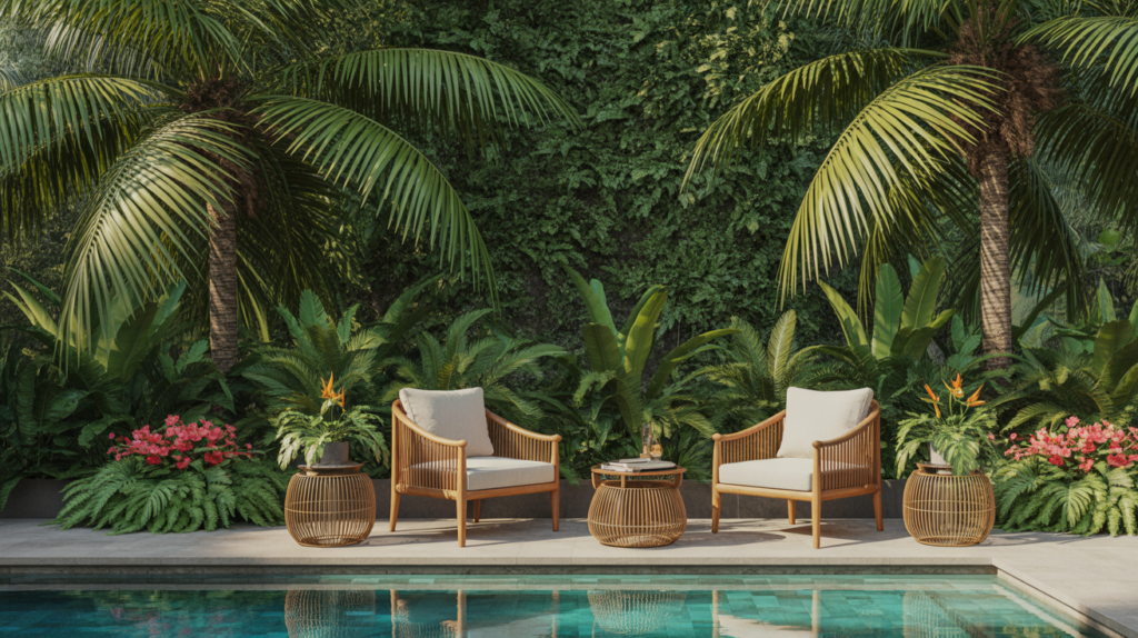 Enhance the space with colorful cushions and tropical prints to add personality and warmth. If you have a pool, position seating areas nearby to create a resort-style layout. Soft lighting, such as tiki torches or string lights, can elevate the ambiance in the evening. This outdoor space becomes a personal paradise where you can unwind, entertain, and enjoy the beauty of nature without leaving home.