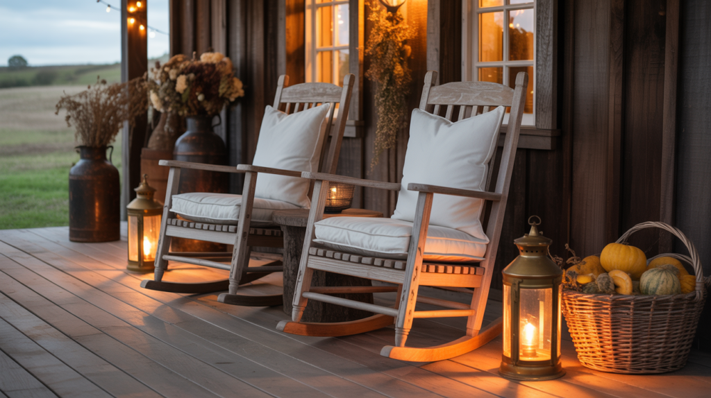 A rustic farmhouse porch brings timeless charm and warmth to your outdoor living space. Start with classic wooden rocking chairs or a porch swing paired with soft white cushions for comfort. Incorporate vintage-inspired decor such as metal lanterns, distressed wood tables, and enamel accents to create an authentic farmhouse feel. This style is all about creating a welcoming environment that feels both nostalgic and cozy.