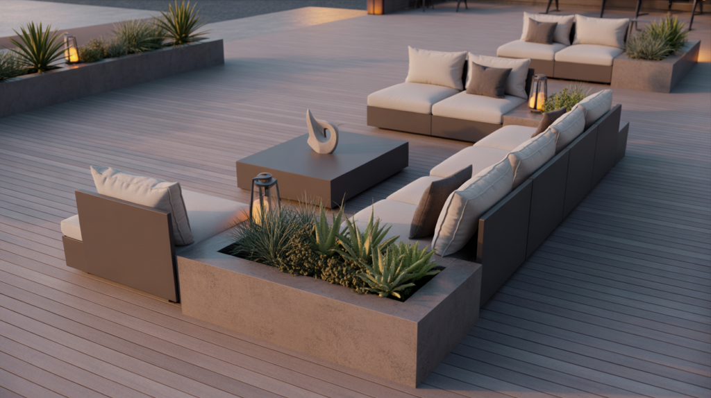 A modern minimalist deck focuses on simplicity, clean lines, and a clutter-free environment. Choose streamlined furniture in neutral tones like black, white, or gray to create a sophisticated and polished look. Keep decor minimal, opting for a few statement pieces such as large concrete planters or a sculptural chair. The goal is to create a calm and visually balanced space that feels open and airy.