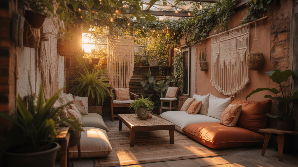 A cozy boho patio retreat is all about comfort, texture, and a relaxed vibe that invites you to unwind. Start by layering soft floor cushions, patterned rugs, and throws in earthy tones to create a welcoming seating area. Add macramé wall hangings or hanging planters to bring in that signature bohemian charm. Low wooden tables and lanterns enhance the laid-back feel, while warm string lights create a magical glow as the sun sets.