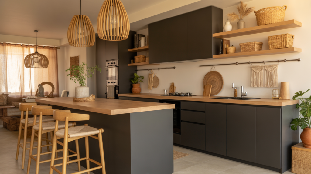 A black boho kitchen creates a bold and modern twist on traditional bohemian style. Black cabinets paired with natural wood and rattan elements balance darkness with warmth. The result is dramatic yet cozy.