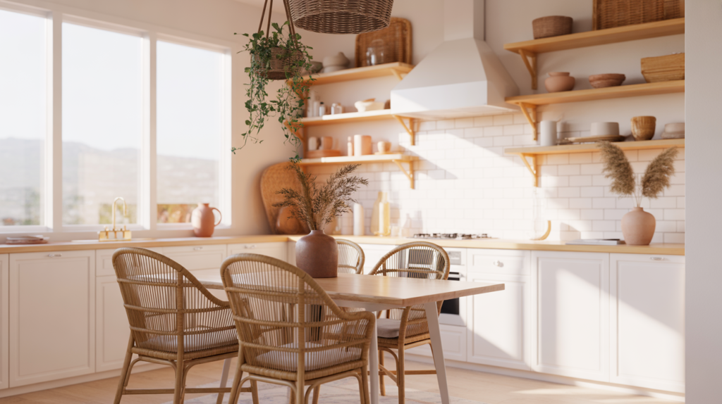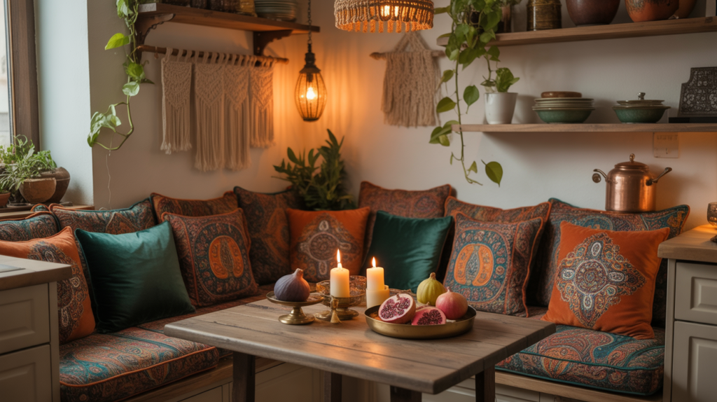 A boho kitchen nook creates a cozy and intimate dining space. Soft cushions, small wooden tables, and warm lighting make the area feel inviting and relaxed. Earthy tones enhance the comfort.