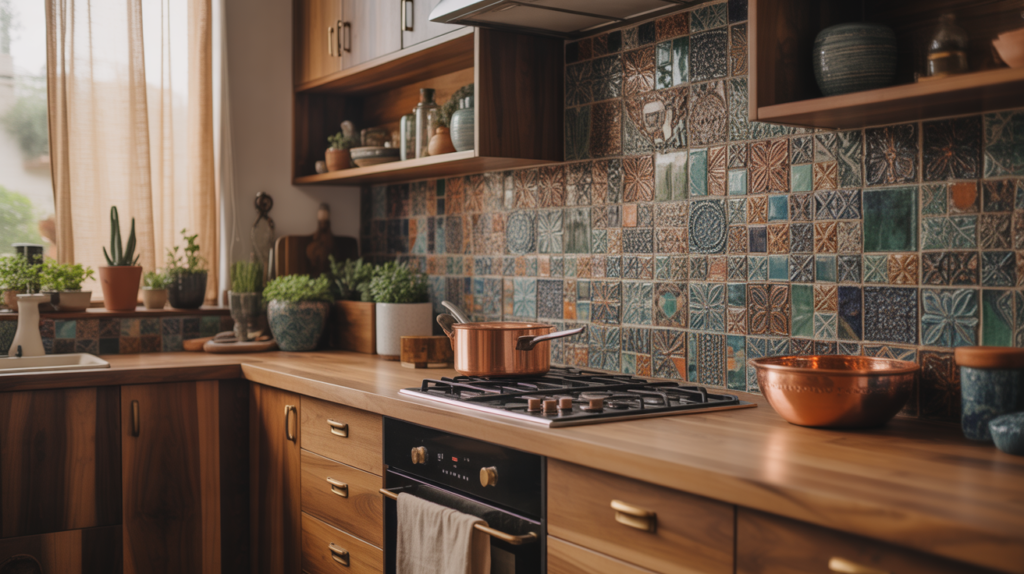 Patterned tiles instantly transform a boho kitchen into a visual masterpiece. Moroccan or geometric tile designs add color, texture, and cultural depth. Paired with wooden cabinets, the contrast feels warm and artistic.