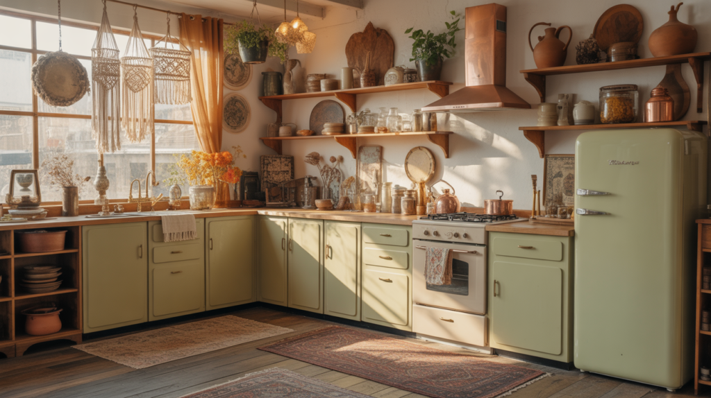 A vintage boho kitchen blends old-world charm with artistic flair. Retro appliances, antique décor, and warm muted tones create a nostalgic yet stylish environment. The mix of textures and eras gives the space personality.