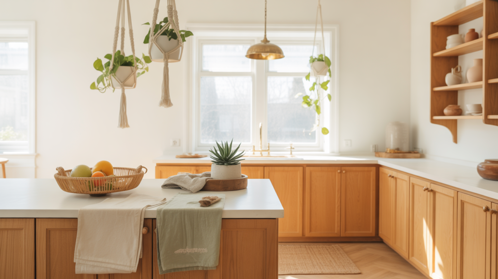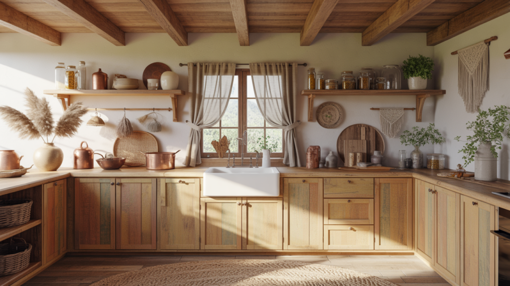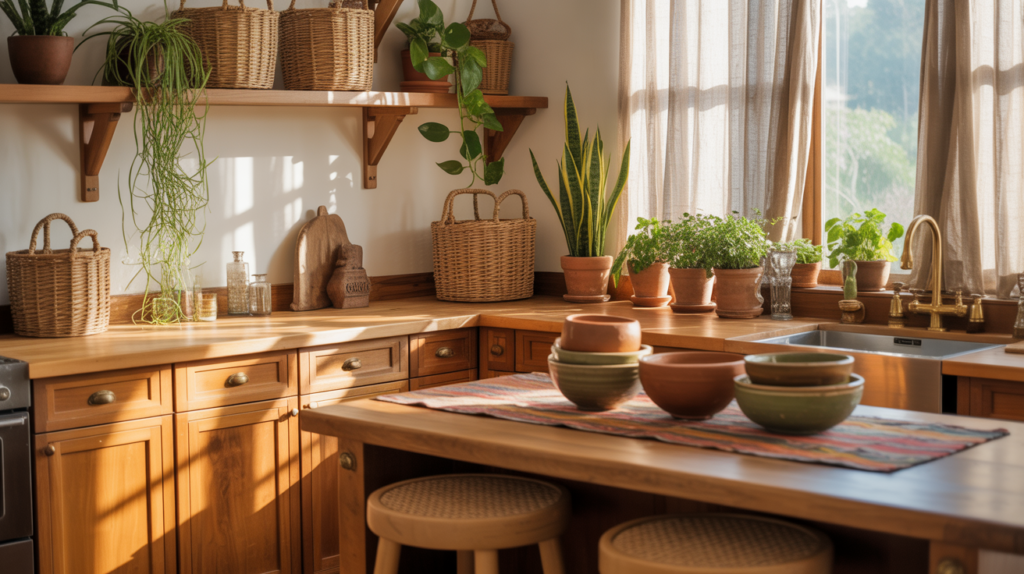An earthy boho kitchen focuses on natural materials and warm, grounded tones. Wooden cabinets paired with clay or beige accents create a soft, organic atmosphere. Woven baskets, rattan details, and handmade ceramics add texture and personality. The overall space feels relaxed, inviting, and deeply connected to nature.