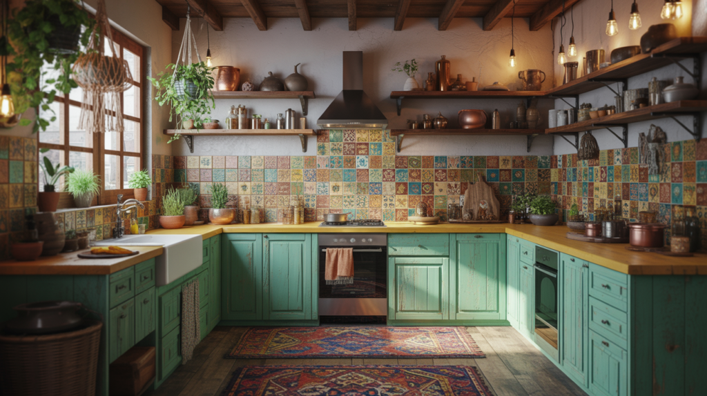 A colorful bohemian kitchen is full of personality and creative energy. Vibrant tiles, mixed patterns, and bold décor pieces create a lively and artistic environment. The combination of rich reds, blues, yellows, and greens makes the space visually dynamic and expressive.