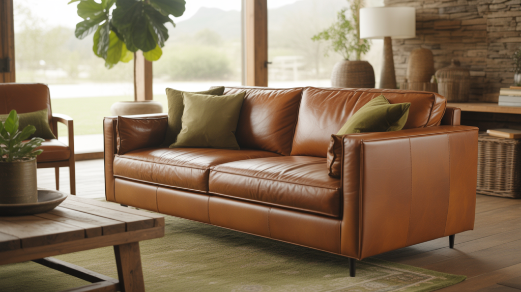Olive green is an earthy tone that pairs effortlessly with brown leather furniture. The muted green enhances the natural qualities of leather and creates a balanced and organic palette. This combination feels calm and grounded.