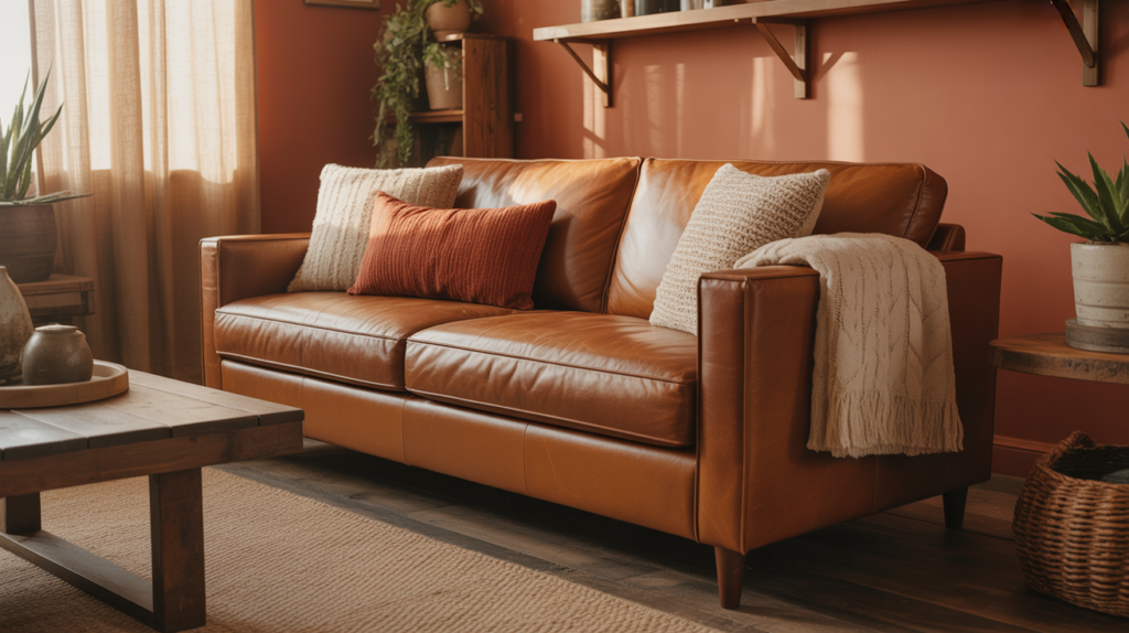 Terracotta tones enhance the warmth of brown leather furniture, creating a rich and earthy color palette. Both colors share similar undertones, which allows them to blend seamlessly while still adding visual depth. This pairing feels natural and cohesive.