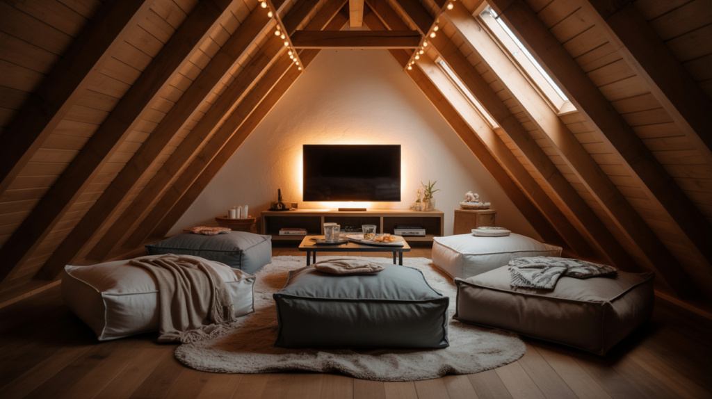 An attic TV lounge offers a cozy and intimate entertainment space. Low seating such as sofas or cushions works well with the limited height. A mounted screen or projector completes the setup.