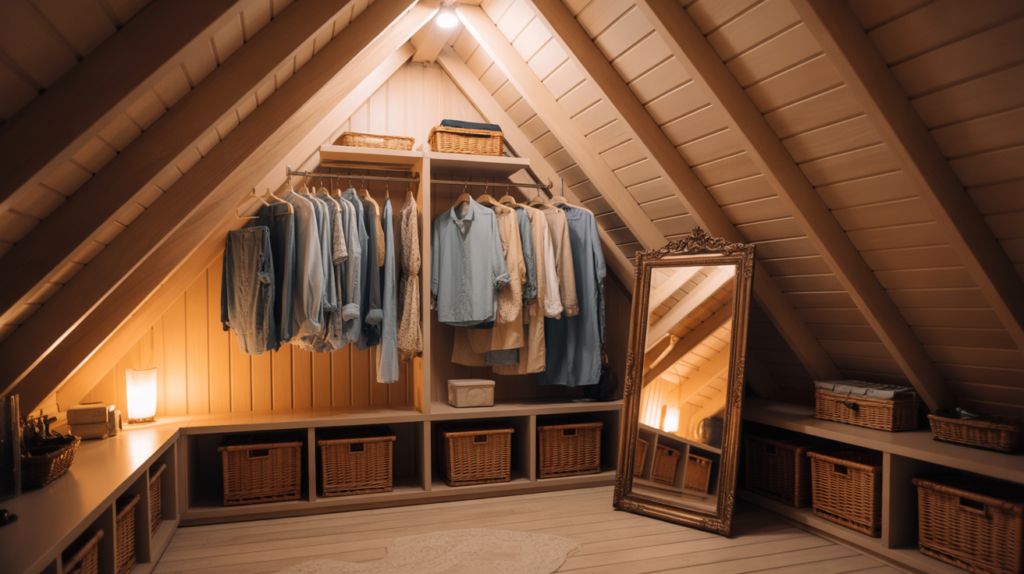 An attic dressing room is a practical and stylish way to use a small space. Low clothing racks and built-in storage fit perfectly under sloped ceilings. Adding a mirror and soft lighting enhances functionality.