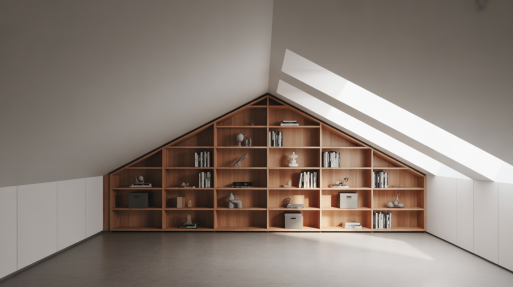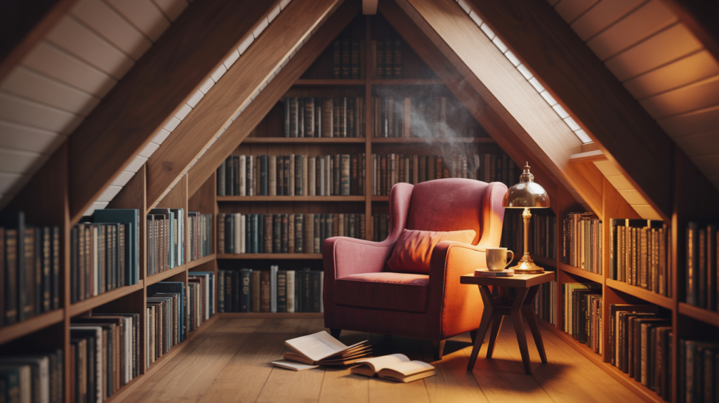 Creating a library wall in your attic adds both function and charm. Installing shelves along the sloped walls allows you to store books without wasting space. A small seating area completes the setup.