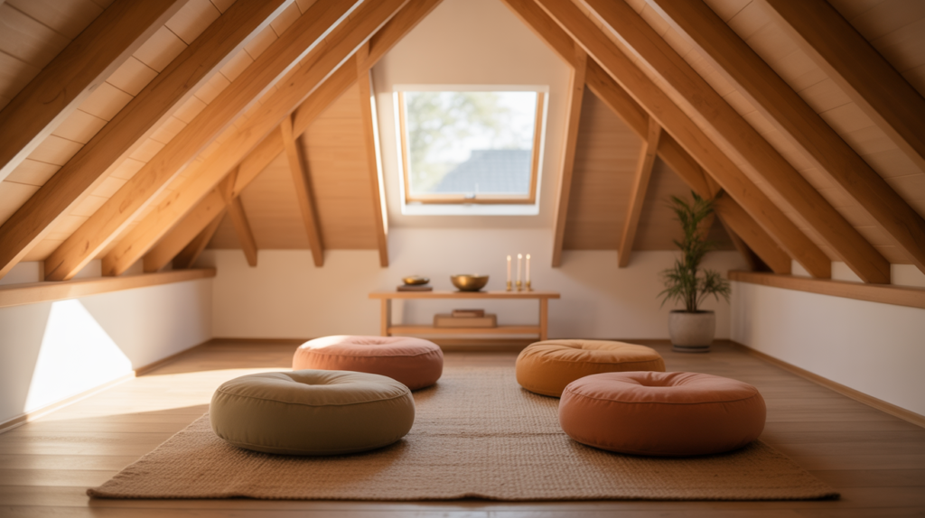 Avoid clutter and focus on a few meaningful decor elements to maintain a शांत atmosphere. This setup is ideal for relaxation, mindfulness, or yoga. It turns your attic into a personal sanctuary where you can unwind and recharge.