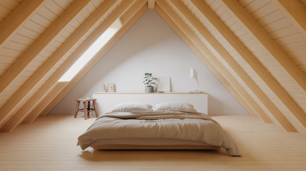 A minimalist sleeping space works perfectly in a small attic with a low ceiling. A low-profile bed or even a mattress placed directly on the floor helps maximize headroom while maintaining comfort. Keeping the design simple with neutral tones and minimal decor prevents the room from feeling cramped or cluttered.