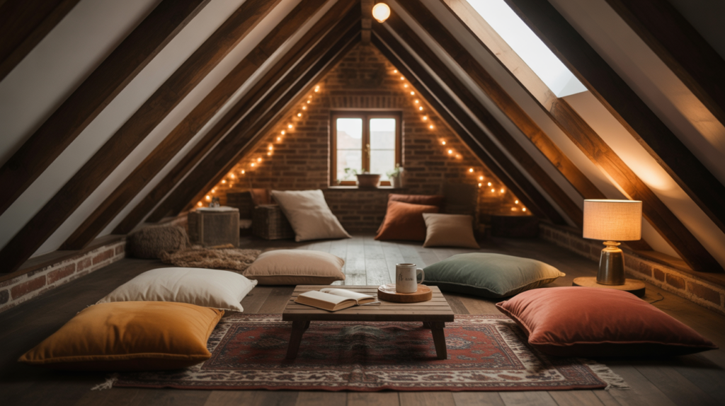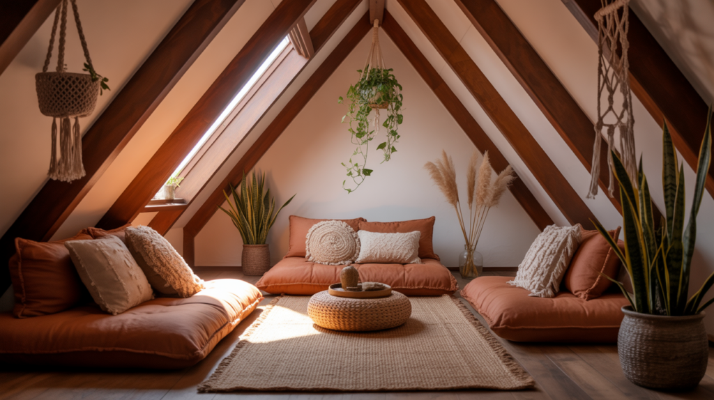 A boho-style attic retreat brings warmth and personality to a small space. Layered rugs, low seating, and natural textures create a relaxed and inviting atmosphere. This style works well with low ceilings, as it emphasizes comfort and informal design.