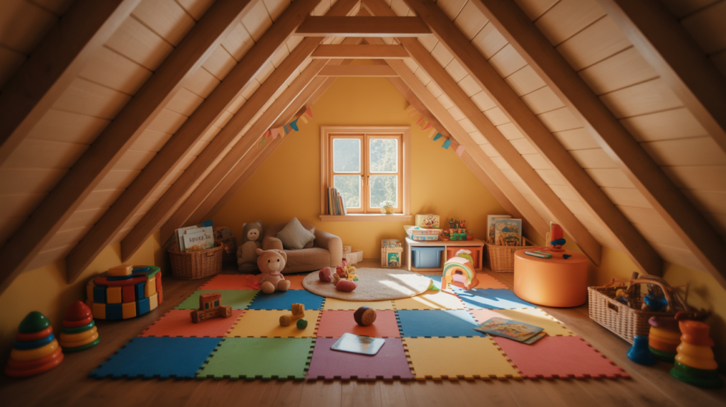 A low-ceiling attic is an ideal space for a kids’ playroom. Since children don’t require as much headroom, the space can be used effectively without feeling restrictive. Soft flooring, colorful decor, and organized storage create a fun and safe environment for play.