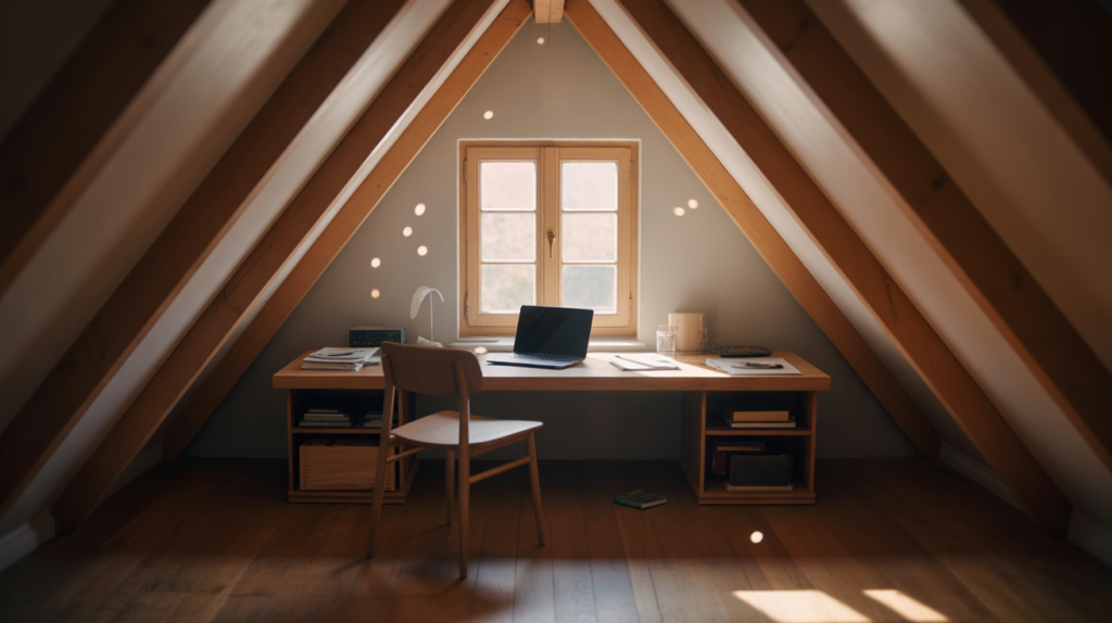 A floor desk setup is ideal for low-ceiling attic spaces. Sitting on cushions or a low chair allows you to work comfortably without needing much headroom. This design is simple and space-efficient.