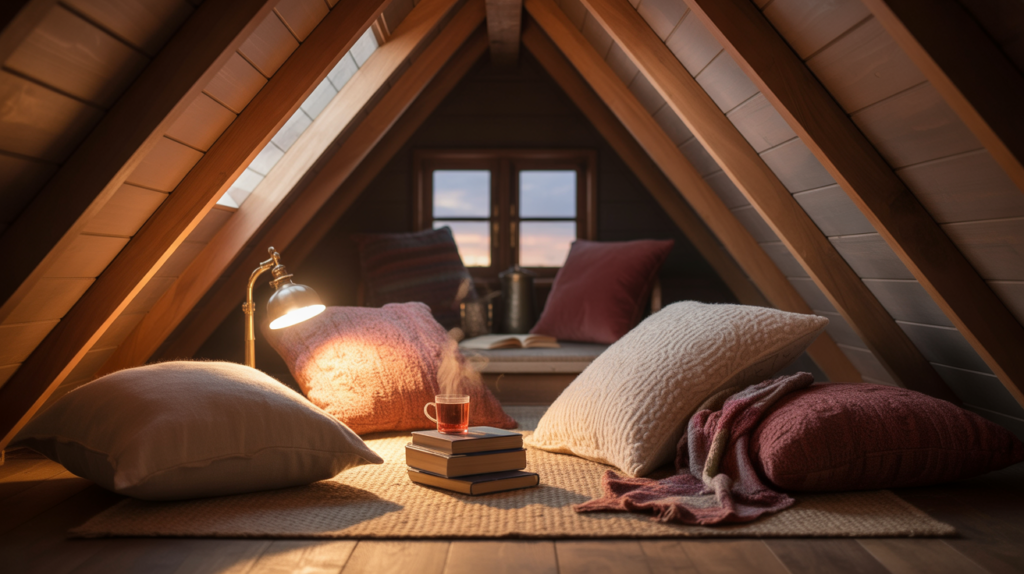 Using soft textiles throughout your attic can transform it into a warm and inviting retreat. Layering rugs, cushions, and throws adds comfort and texture while softening the space. This approach works well with low ceilings by emphasizing coziness.