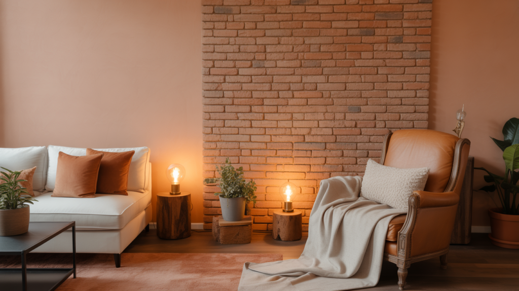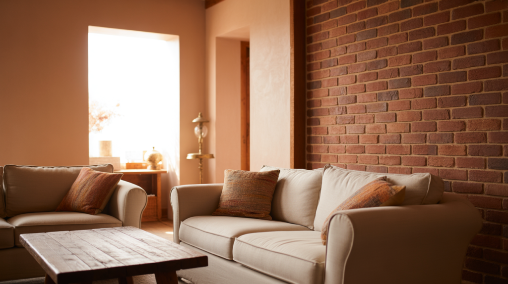 Soft peach adds a gentle warmth that enhances red brick beautifully. Its subtle pink undertones brighten the space while maintaining a cozy feel. This pairing feels warm and inviting.