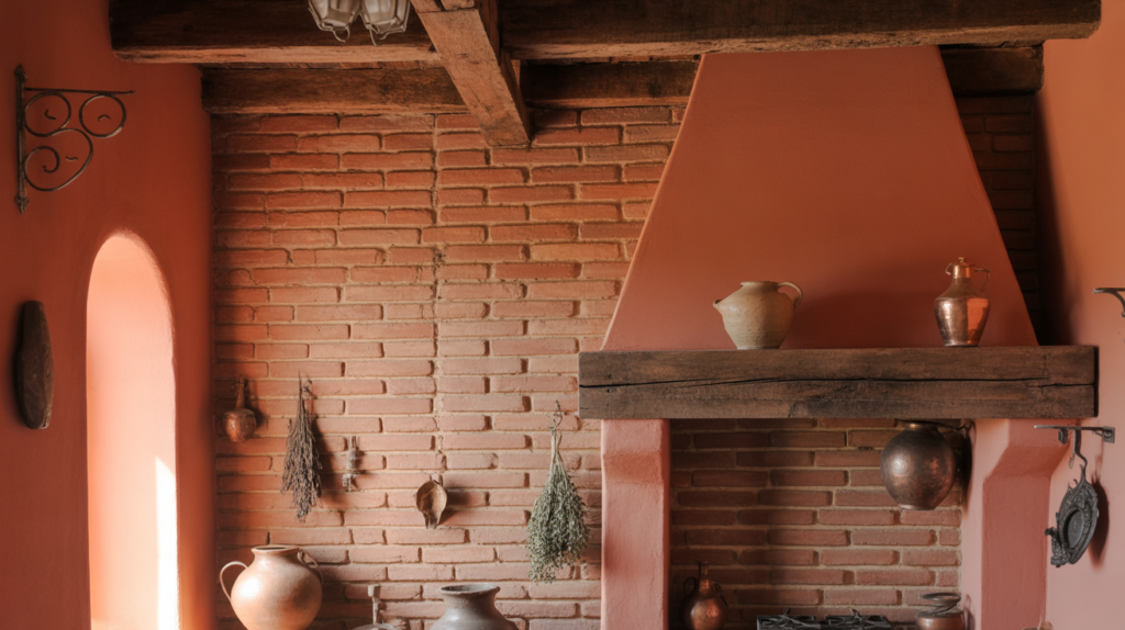 Warm clay tones complement the natural earthy shades of red brick. The combination feels cohesive and inspired by nature. It creates a grounded and welcoming atmosphere.